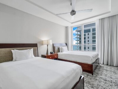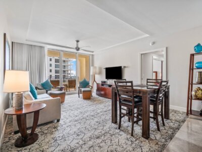 This larger 2/2 Ocean view luxury suite features a south facing balcony offers breath-taking views of the beach to the intracoastal waterways and the sky line of the Palm Beach cities. This newly renovated spacious 1397 sf condo features a King Bed, 2 double beds, a Queen pull out sofa bed, and two full baths fun to 9 guests to enjoy.