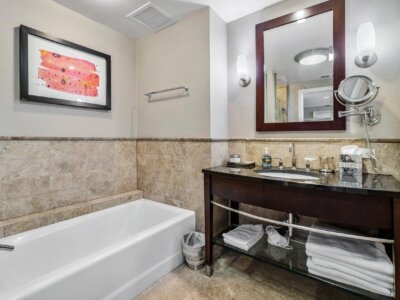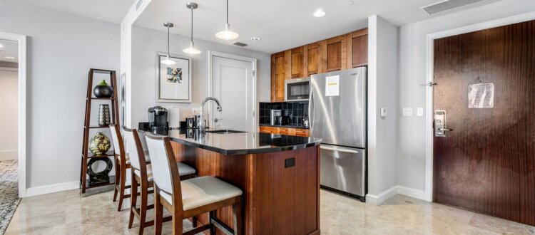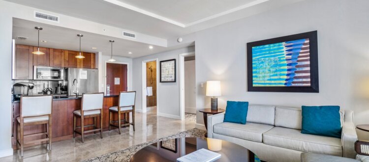 - Upscale amenities and home-like comforts in this large 1344 square foot Hotel Suite with a full kitchen and washer/dryer
