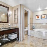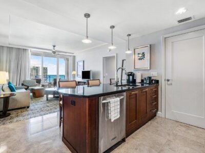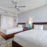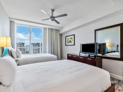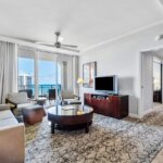 This larger 1344 sf 2/2 Ocean view luxury suite features a North facing balcony offers breath-taking views of the beach and intracoastal waterways. This newly renovated spacious Resort Suite features a King Bed, 2 double beds, a Queen pull out sofa bed, and two full baths fun to 9 guests to enjoy.