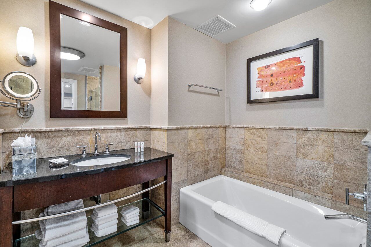 - Upscale amenities and home-like comforts in this large 1300 square foot Hotel Suite with a full kitchen and washer/dryer