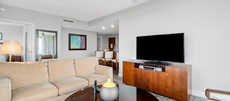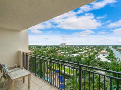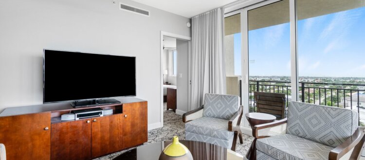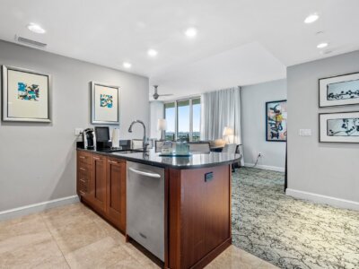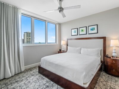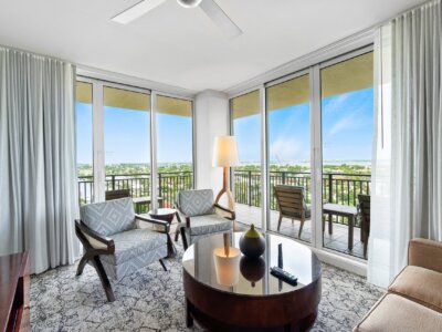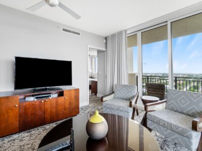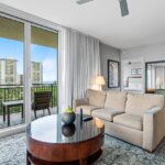 This 2/2 Ocean view luxury suite features a wrap around balcony offers breath-taking views over Ocean Reef Park stretching from the beaches to the intracoastal waterways and the sky line of the Palm Beach cities. This newly renovated spacious 1311 sf hotel suite features a King Bed, 2 double beds, a Queen pull out sofa bed, and two full baths for 6 guests to enjoy.