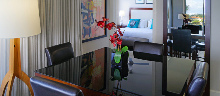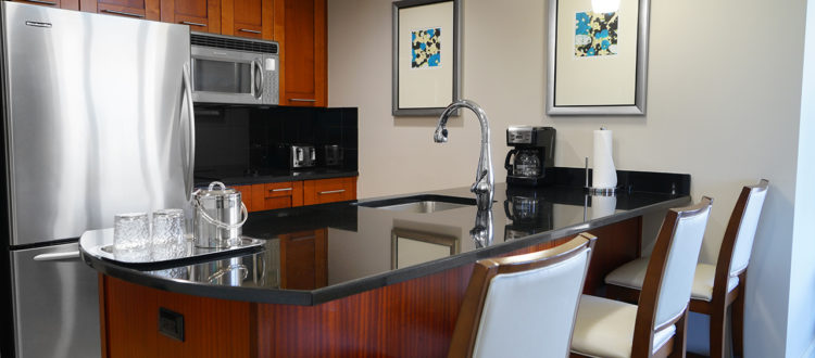 - Upscale amenities and home-like comforts in this large 1058 square foot under air – hotel suite