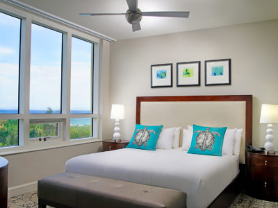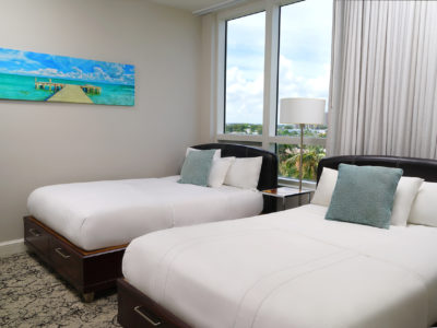 This 2/2 Ocean view luxury suite features a wrap around balcony offers breath-taking views over Ocean Reef Park stretching from the beaches to the intracoastal waterways and the sky line of the Palm Beach cities. This newly renovated spacious 1311 sf hotel suite features a King Bed, 2 double beds, a Queen pull out sofa bed, and two full baths for 8 guests to enjoy.