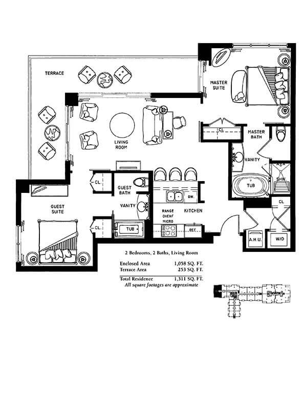 - Upscale amenities and home-like comforts in this large 1058 square foot under air – hotel suite